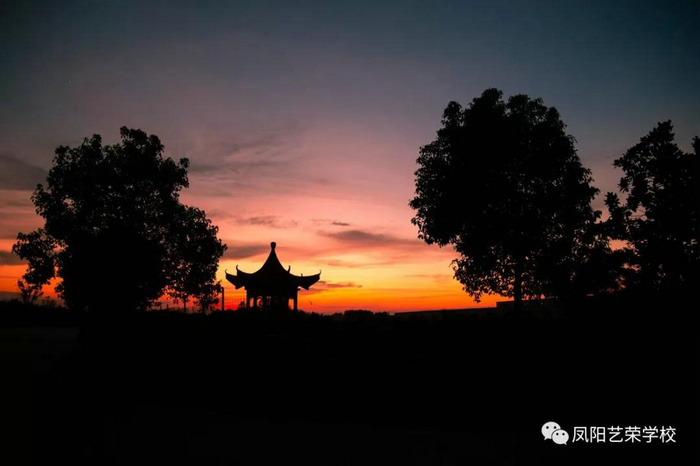 漫步校园,独坐望月亭,看看艺荣的天空,宛如仙女穿着火红的裙子向你走来……